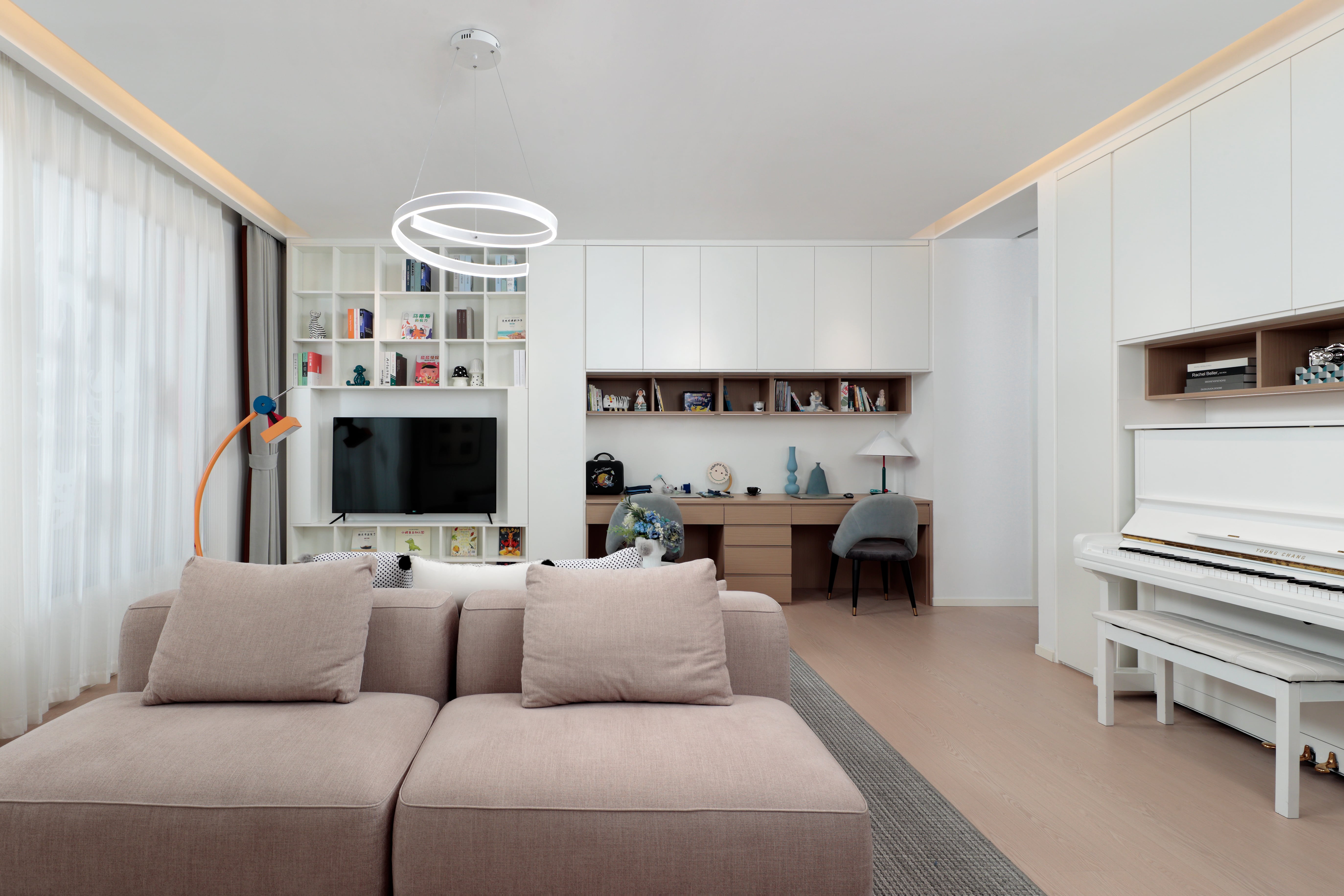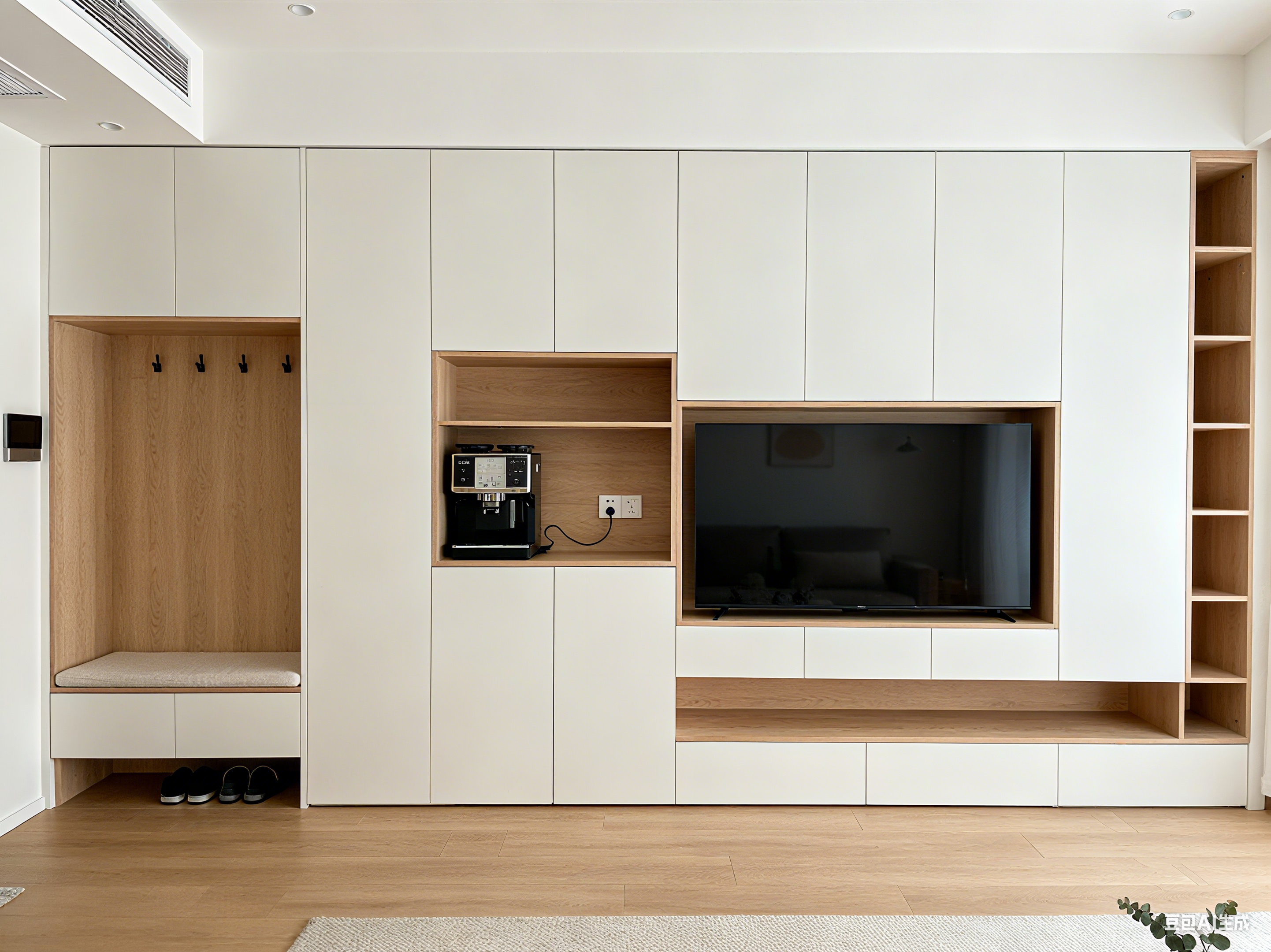 有的家庭入户进来直接对着客厅窗户,从玄关到客厅的墙面如果能全部利用起来,做一字型贯通设计的满墙柜,储物空间不仅更大,视觉上还更整齐统一。